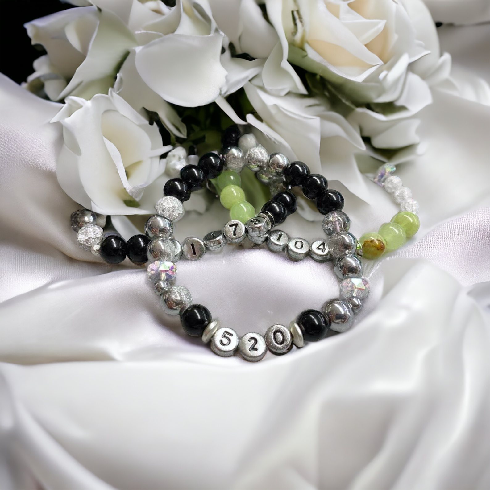 A Grabovoj karkötő 6-8-10 mm-es gömbökből különböző számokból, összekötő elemekből áll, rugalmas ékszerdamilra fűzve.